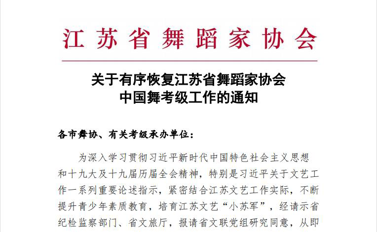 为深入学习贯彻习近平新时代中国特色社会主义思想和十九大及十九届历届全会精神,特别是习近平关于文艺工作一系列重要论述指示,紧密结合江苏文艺工作实际,不断提升青少年素质教育,培育江苏文艺“小苏军”,经请示省纪检监察部门、省文旅厅,报请省文联党组研究同意,从即日起有序恢复省舞协中国舞考级工作。