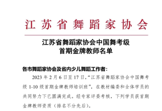 2023年2月6日至17日,“江苏省舞蹈家协会中国舞考级1-10级首期金牌教师培训班”,在教材编委和全体学员的共同努力下已圆满完成。经专家评委考核,下列学员获首期金牌教师资质(排名不分先后)。