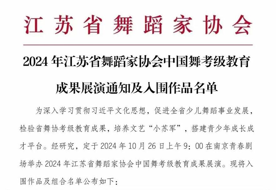 2024年江苏省舞蹈家协会中国舞考级教育成果展演通知及入围作品名单
