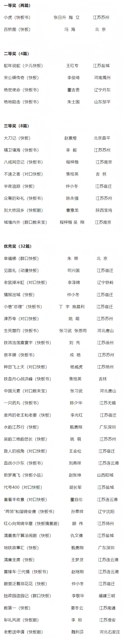 江苏省第四届原创快板作品征集评比活动自今年8月启动以来,共收到来自全国各地的投稿作品96篇。经省曲艺家协会组织专家进行初评、终评两轮严格评审,最终评选出46篇获奖作品。