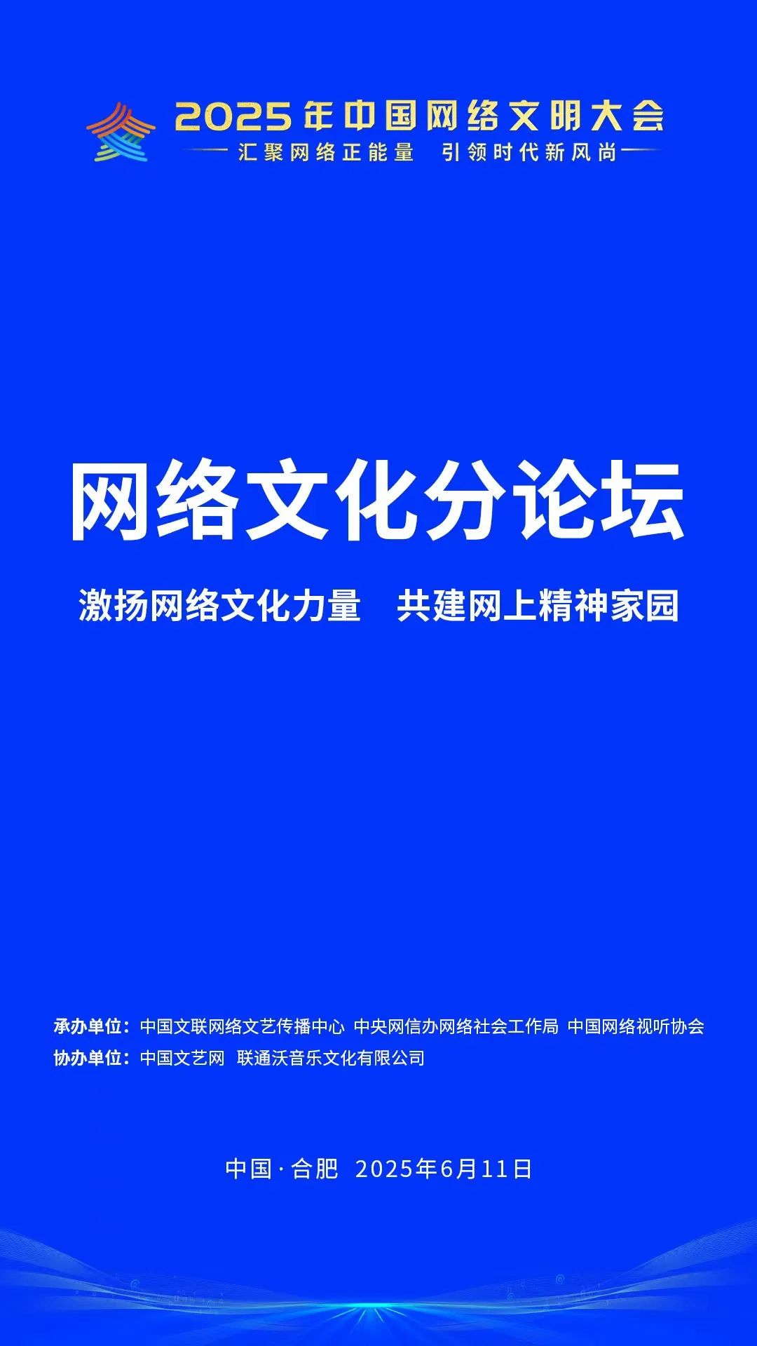 2025年中国网络文明大会网络文化分论坛由中国文联网络文艺传播中心、中央网信办网络社会工作局、中国网络视听协会承办,中国文艺网、联通沃音乐文化有限公司协办。
