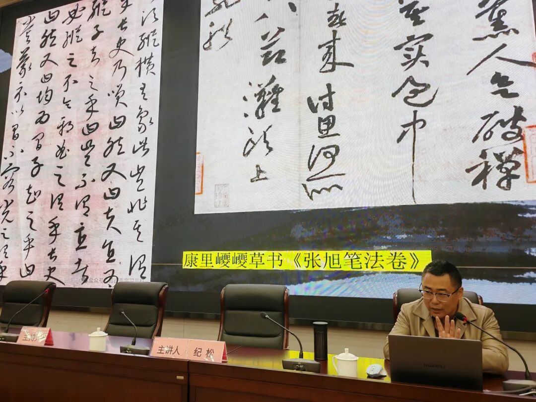 本次讲座以“从形式美的视角探寻草书技法门径”为主题,纪松先生结合自身多年创作实践与理论研究,以形式美为独特切入点,带领大家层层深入探寻草书的技法门径。他深入浅出地讲解了草书的笔墨规律、结构章法与审美内核,从线条的刚柔曲直、墨色的浓淡干湿,到章法的疏密错落、结构的虚实相生,用专业又通俗易懂的方式拆解了草书形式美感背后的技法要点,同时分享了自身的学习路径与创作心得。整场分享兼具理论高度与实践深度,不仅让听众读懂了草书形式美与技法的内在关联,更让人在笔墨韵味中,深切感受到中华书法艺术的无穷魅力。