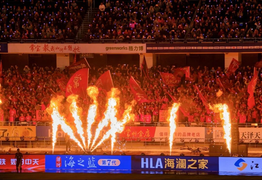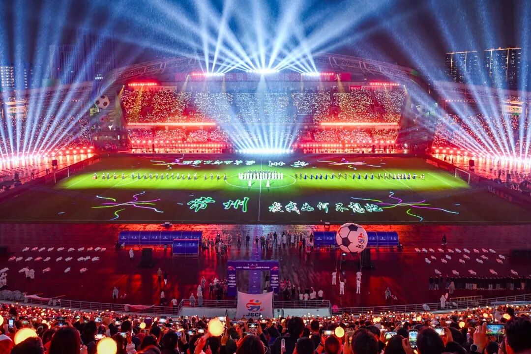 夜幕下的常州奥体中心灯火璀璨,4万余名球迷齐聚一堂,全场座无虚席。开幕式以科技与文化融合的创意表演,拉开苏超新赛季的序幕。