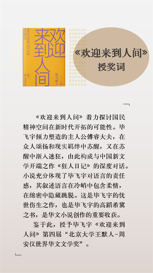 11月12日,第四届北京大学王默人—周安仪世界华文文学奖颁奖典礼在北京大学英杰交流中心阳光厅举行。赵园《灯火》、陈冲《猫鱼》、毕飞宇《欢迎来到人间》共摘奖项。