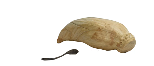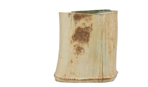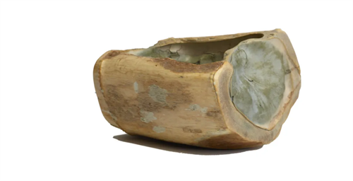 一段千年老竹,经历了千年的风霜雪雨。一侧,不知何时被何人提刀削去一片,从而展露出老竹段的内在风景。干枯的竹身,依然是那般挺拔,虫食之处,如同跳动的音符,随意散落;经年雨水的腐蚀,反倒让其留下了美丽的各种斑纹;气候的冷热变化,使之出现了细长裂纹,干枯的竹身内膜亦自然翘起。如此种种,虽满身斑驳陆离,但依旧不失其特有的君子风度与气节,从而显得更加淡泊从容,风骨依旧。