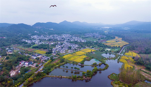 佘村地处南京市江宁区青龙山麓,三面山峦环绕,一面紧邻水域。这里黄龙山石灰石等非金属矿产储量大,曾因得天独厚的地理条件而长期依赖山石资源。20世纪70年代初至21世纪初,有8家乡村集体企业开采石灰石烧制石灰。因过度开采,村子周边环境遭到破坏,曾一度被称为“矿山村”。2016年起,佘村以美丽乡村建设为契机,关停污染产业,复绿矿山宕口,修复九龙埂观赏农田,种植油菜、梨树、茶叶等经济作物。其中梨花谷占地500亩,内有梨园240亩、车厘子园220亩、精品果园40亩,是大自然的剧场。每年三月油菜花、四月梨花竞相绽放,吸引游客踏歌而行,生态发展的“含绿量”显著提升,形成四季皆景的田园画卷。