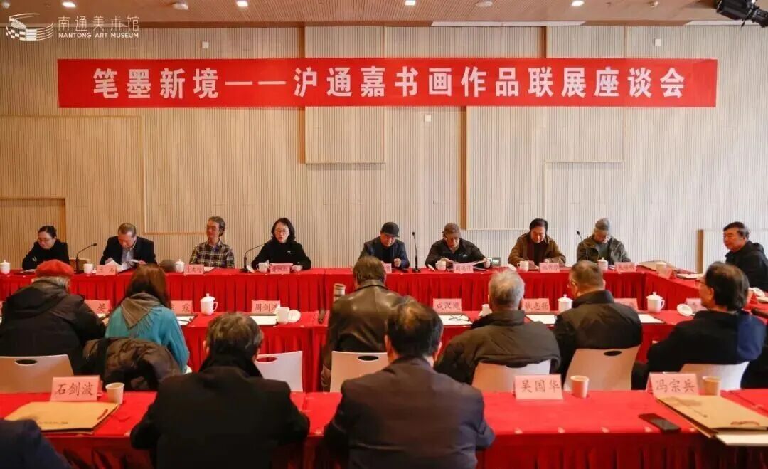 来自上海、嘉兴、南通三地的领导嘉宾集体观展。观展结束后,随即召开了展览座谈会。围绕“笔墨新境”的展览主题,与会人员就海派艺术的当代演进、江海文化与江南文脉在书画中的融合表达,以及传统笔墨语言如何回应新时代审美等核心问题展开了热烈对话。