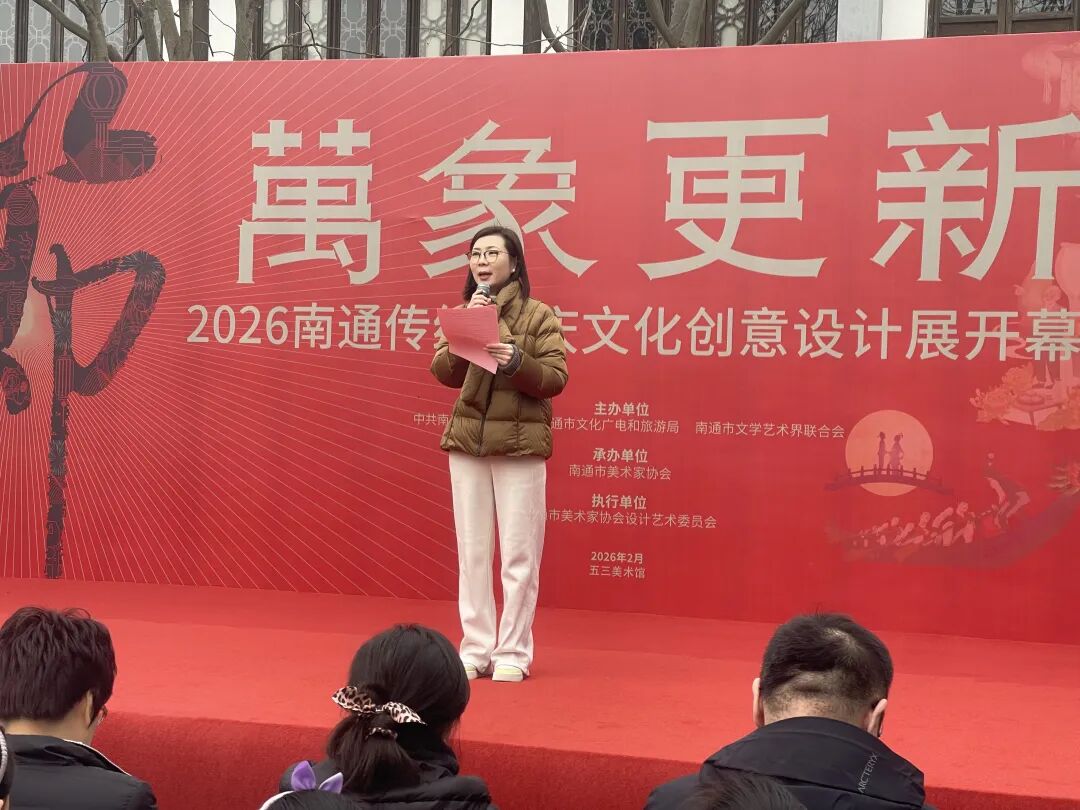 2026年2月10日下午,“万象更新”2026南通传统节庆文化创意设计展在五三美术馆开幕。中共南通市委宣传部副部长、新闻出版局局长盛慧琴,南通市文学艺术界联合会党组书记、主席张华,南通市文化广电和旅游局党组成员、副局长冯莹,中共南通市委宣传部文化改革发展处处长陈东,南通市文化广电和旅游局公共服务处处长季天龙,中共南通市委宣传部文化改革发展处副处长金思珺 ,南通市美术家协会秘书长陈霞及来自主承办单位的工作人员、策展人、参展设计师及各高校的师生代表与广大市民一道见证开幕活动。
