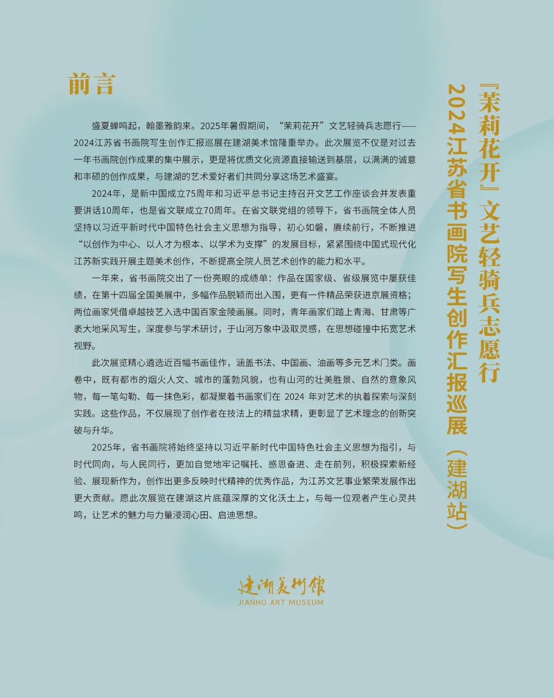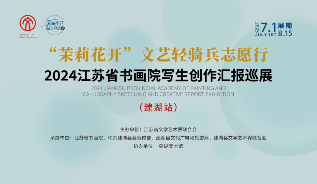 为深入贯彻党的二十届三中全会精神,积极响应让优质文艺资源直达基层的号召,由江苏省书画院组织的“茉莉花开” 文艺轻骑兵志愿行——2024江苏省书画院写生创作汇报巡展,于2025年7月1日在建湖美术馆正式拉开帷幕。此次展览不仅是对过去一年江苏省书画院创作成果的一次集中性、系统性展示,更是落实文化惠民有关部署,将高雅艺术与人民群众紧密相连,让大家在家门口看大展。