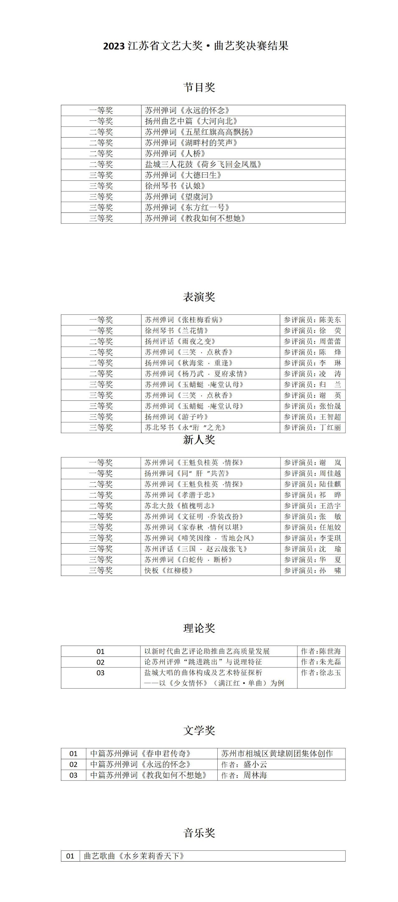 10月22日至25日,江苏省文艺大奖·第十届曲艺奖终评在苏州昆山举行,在组委会、监审委员会的领导和监督下,评审委员会坚持公平、公正、公开原则,对参评节目奖、文学奖、理论奖和音乐奖四类作品,通过审看文本、视频,在充分讨论的基础上,由评委独立评分;表演奖、新人奖采用舞台表演,现场打分、亮分方式进行,确保评奖的客观性、公正性、权威性。根据得分排名,经评审委员会商议并报组委会核准,现将评审结果予以公布: