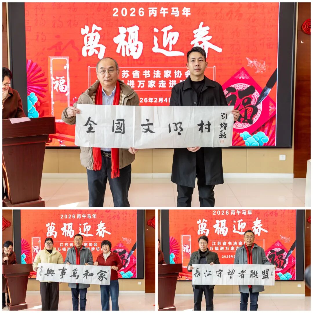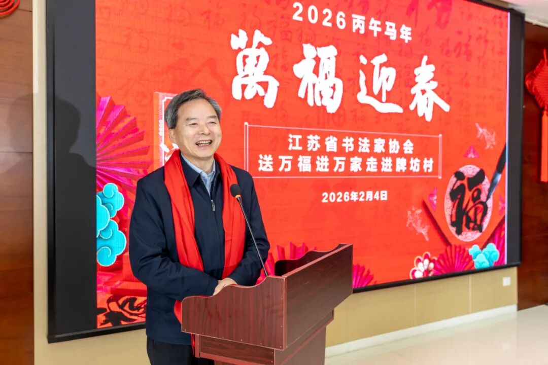 2月4日,2026丙午马年“万福迎春”——江苏省书法家协会送万福进万家活动在江宁区黄龙岘牌坊村举行。江苏省文联一级巡视员刘轩明,省政府参事、省书协副主席刘灿铭,省书协秘书长纪松等一行近20位书法家以及江宁区文联党组书记、副主席王胜华等共同参与了本次活动。活动现场,刘轩明讲话。刘灿铭、纪松分别向牌坊村、全国文明家庭汪龙干家庭以及长江守望者联盟代表赠送书法作品,以翰墨传递敬意与祝福。
