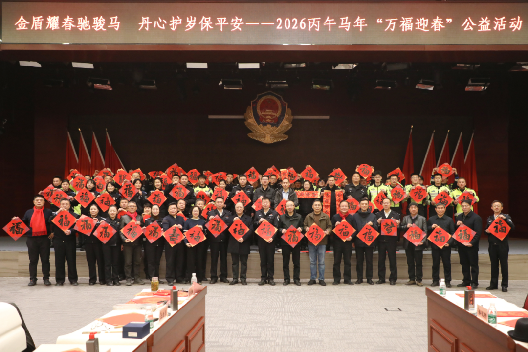在南京市公安局交通管理局活动现场,江苏省书协副主席、市书协主席谢少承,省书协秘书长纪松、市公安文联主席张勇一行专程到访,开展“金盾耀春驰骏马 丹心护岁保平安——2026丙午马年‘万福迎春’”活动。市局政治部副主任万斌,局部分班子成员,市局组宣处相关负责同志及各大队民警、辅警代表近150人参加。书法家们挥毫泼墨,创作出一幅幅寓意吉祥的春联和一张张飘逸饱满的“福”字,表达对公安干警辛勤付出的诚挚问候。民警、辅警们热情参与,现场洋溢着浓厚的节日氛围。