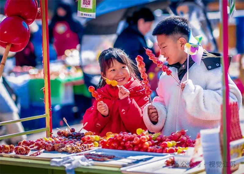 1月29日,徐州市铜山区大彭镇洋溢着浓浓的年味,小兄妹俩开心选购冰糖葫芦。刘立明摄