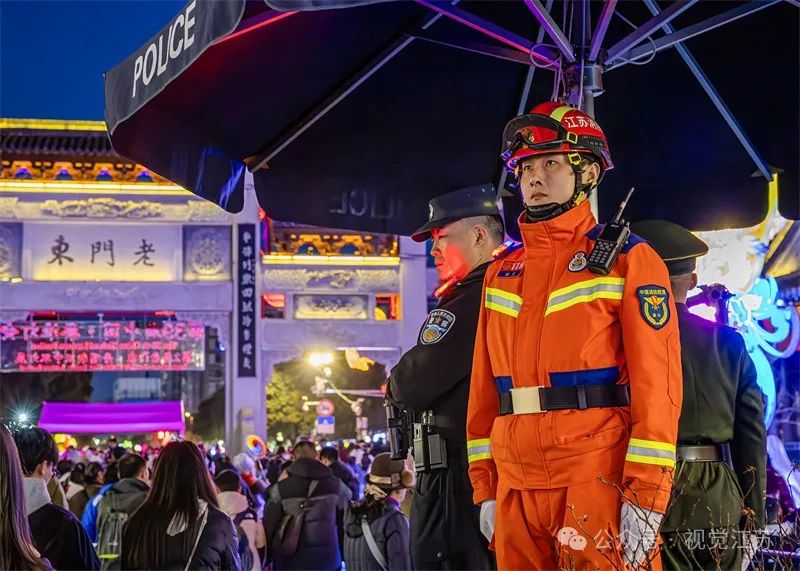 农历大年初一傍晚,南京老门东人流如织。图为执勤的公安、武警、消防三人组合。王昆远摄