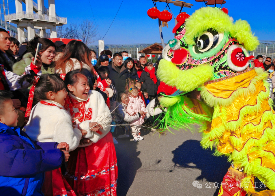 正月初一,在宿迁市洋河新区神农时代文化旅游区,孩子们与舞狮队互动嬉戏,现场欢笑声不断。庄军 摄