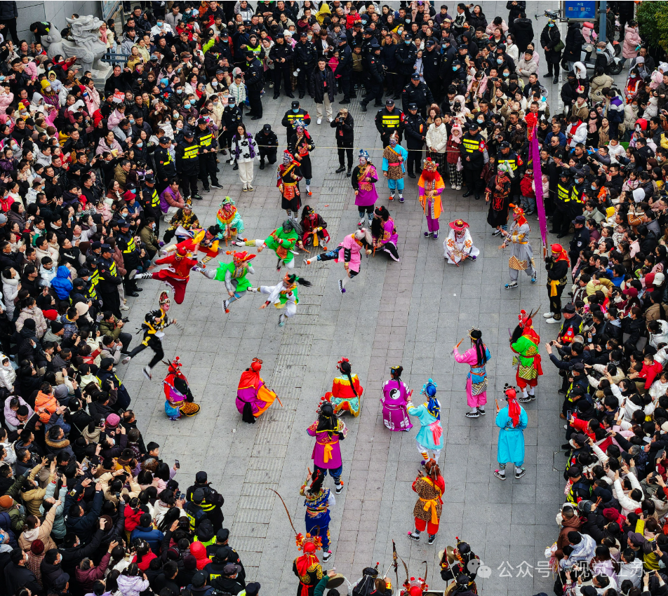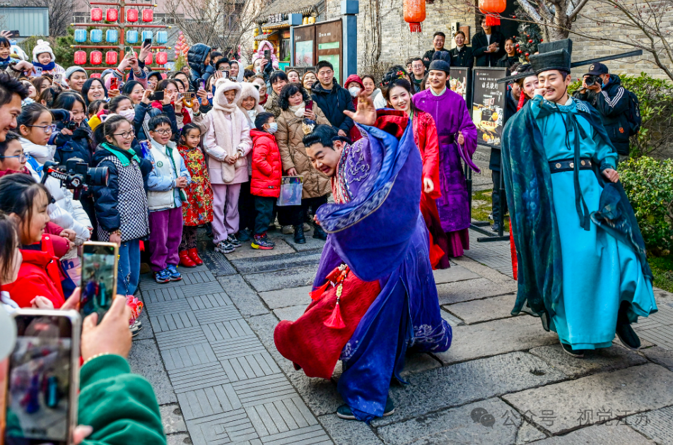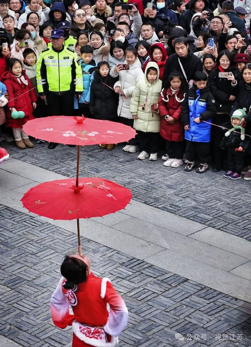 春节期间,扬州高邮老街很是热闹,舞台表演吸引众多人观看。卞菲菲 摄