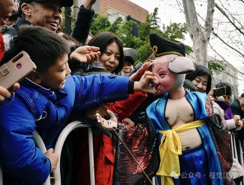 正月初五,南通环城东路非遗如皋木偶巡游活动上,俏皮的八戒向游客问候新年。陈进 摄