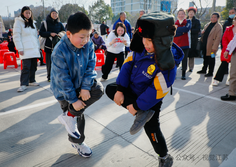 1月30日,南通海安经济技术开发区慧源文化广场,两位小朋友正在玩斗鸡游戏。顾彬斌 摄
