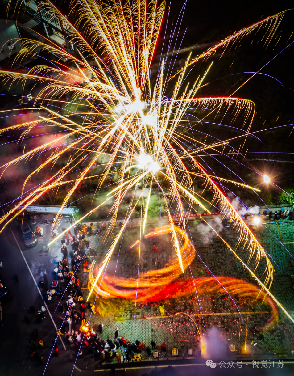 2月2日 ,南京溧水石湫詹家村两条大龙在烟花绽放中飞舞 。王秀丽 摄