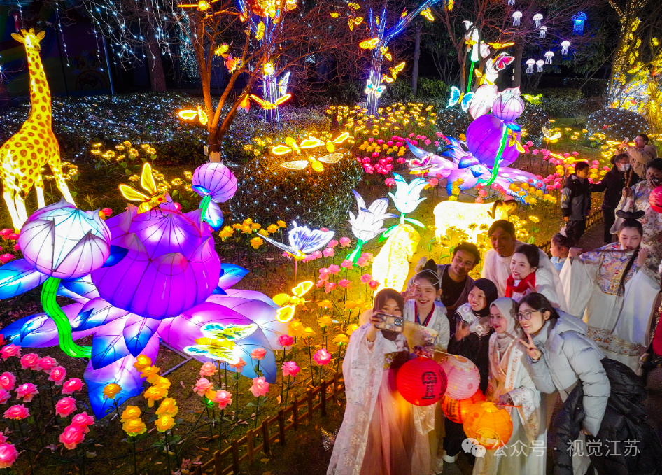 2月12日晚,南通市崇川区“爱上南通 品味崇川”中外文化交流活动在狼山灯会现场举办,身着汉服的中外友人和游客一起赏花灯、看打铁花和夜光舞狮。许丛军 摄