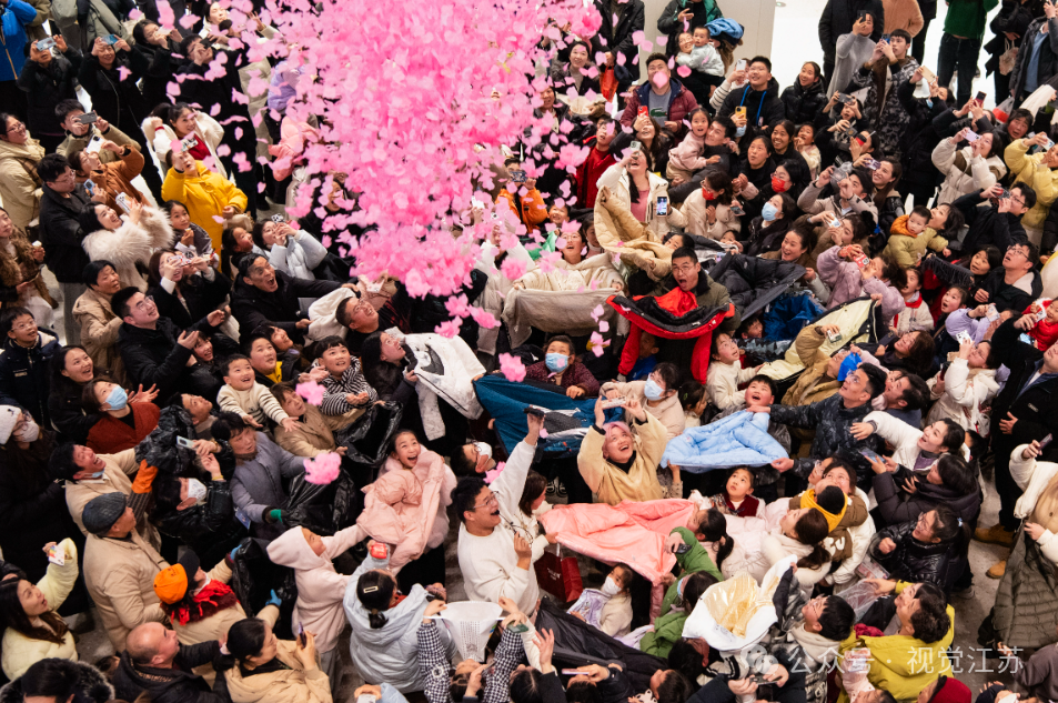 2月14日,在海安喜润城内,人们迎接从空中抛洒下来的花瓣。徐劲柏 摄