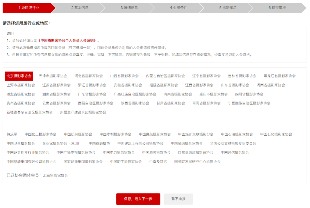 3.选择所属地区或行业。请务必准确选择您所属的团体会员单位(只可选择一项,选择后变红)。选择无误后点击页面下方“保存,进入下一步”按钮。
