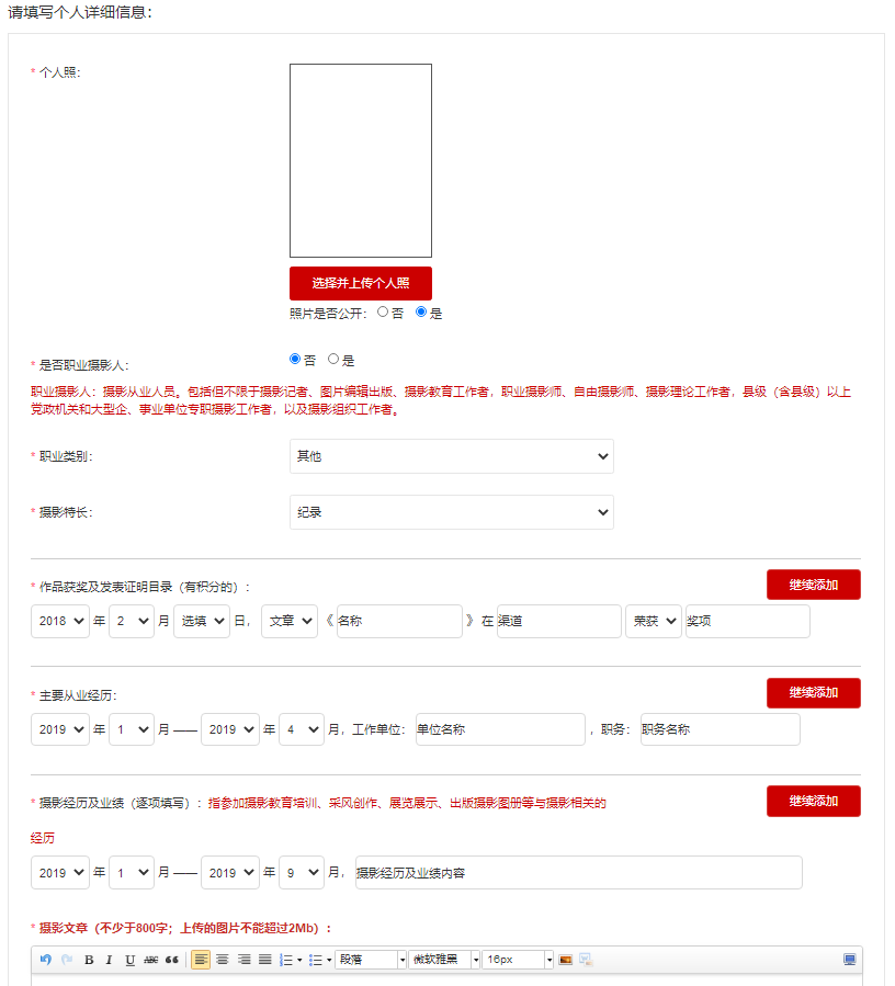 (2)作品获奖及发表证明目录、主要从业经历、摄影经历等3项,请分别逐项填写,点击“继续添加”按钮,可添加多个项,点击“删除”按钮,可删除添加的项。每部分至少填写一项。