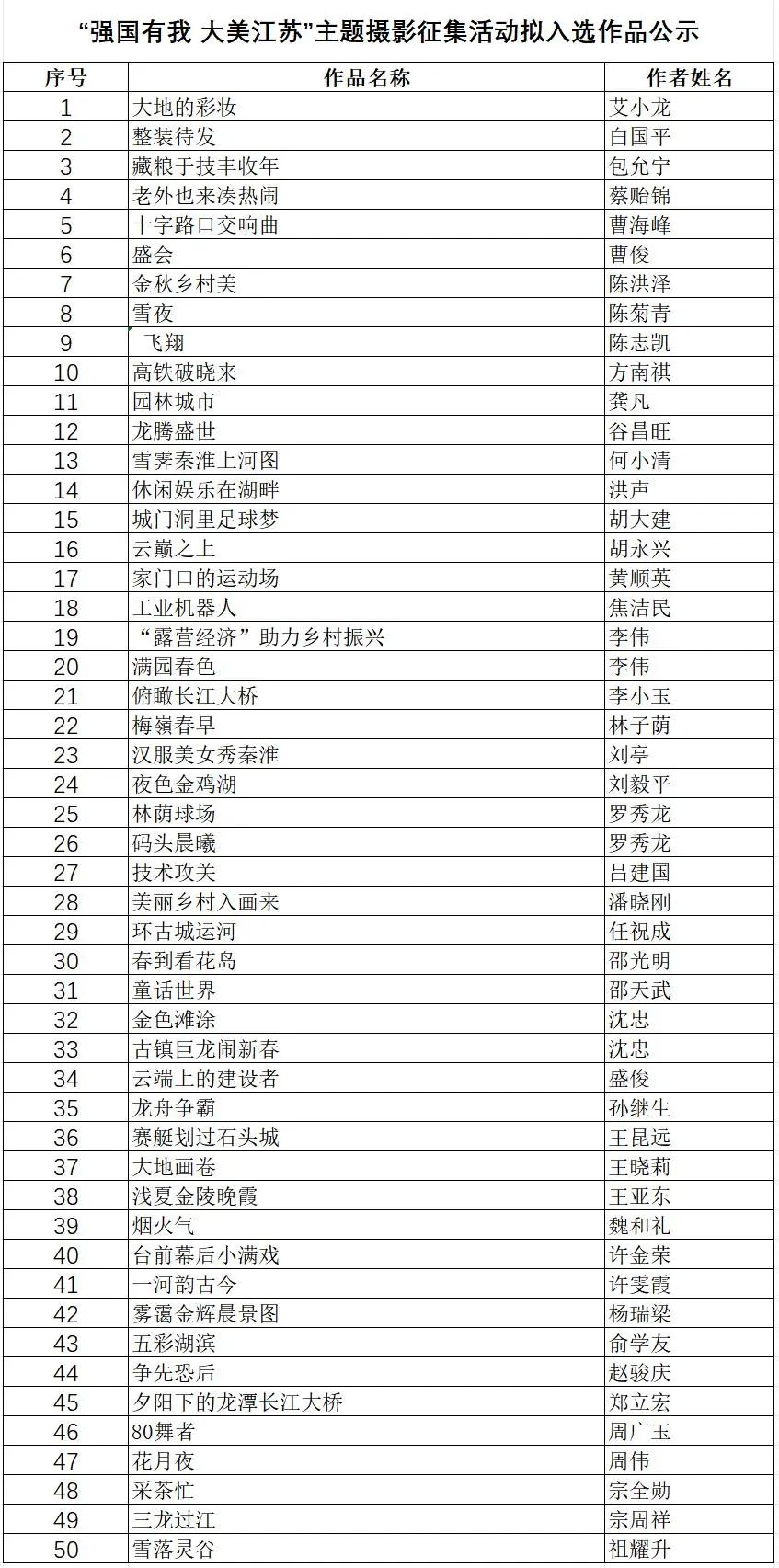 由江苏省摄影家协会、江苏省新闻摄影学会、“学习强国”江苏学习平台联合主办的 “强国有我 大美江苏”主题摄影征集活动,日前评选结束。本次摄影征集活动得到了社会各界的广泛关注和众多摄影家、摄影爱好者的积极参与,收到全国各地800余人投稿作品2500余件。经专家评委会严格评选,共有50幅作品拟入选,现予公示。公示时间为自即日起至2025年6月4日24时结束。公示期间如有异议,请实名反映。