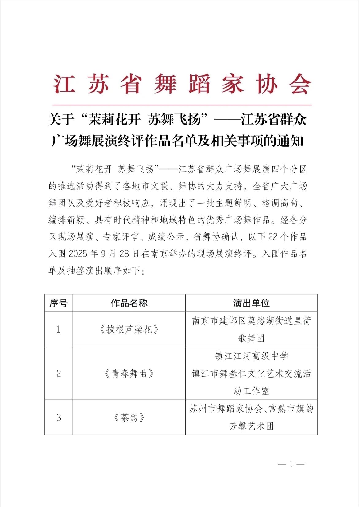 关于“茉莉花开 苏舞飞扬”——江苏省群众广场舞展演终评作品名单及相关事项的通知