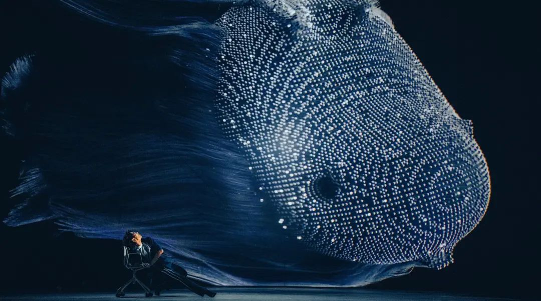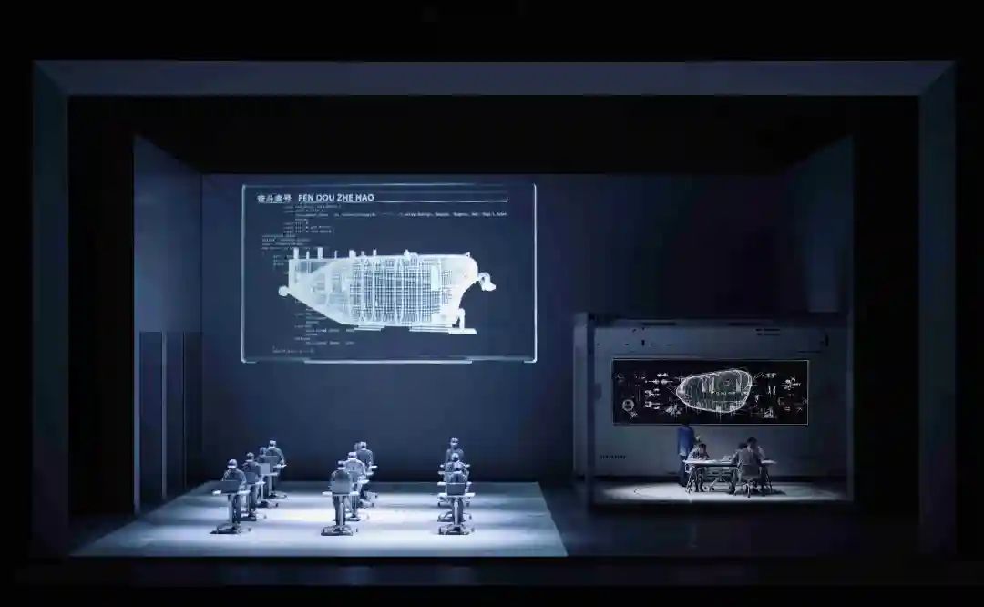 显而易见,创作这样一部视觉设计统领下的“融媒体舞剧”,主创不是“为视觉而视觉”“为融媒体而融媒体”的。那么为的是什么呢?当然是题材表现的内在诉求。这使笔者想起了一段往事:2020年11月10日北京时间上午9点整,中央电视台新闻频道,迅疾而清晰地叠映出一幅幅深渊大洋、科学考察船、水下潜水器的画面……随着叠映的画面,屏幕上出现一行醒目而振奋人心的标题:中国“奋斗者”号载人潜水器万米级试验。主播劳春燕音色激越地播报:“今天我们将共同见证:中国深潜事业乘风破浪的又一个高光时刻——中国‘奋斗者’号载人潜水器万米级海试成功坐底‘马沟’……”这个“马沟”就是位于西太平洋的马里亚纳海沟,深达11034米(我国载人潜水器的坐底处深10909米);坐底“马沟”意味着抵达了人类能够达到的地球最深点。对于我国载人深潜事业和这一高光时刻,习近平总书记致“奋斗者”号全海深载人潜水器成功完成万米海试并胜利返航的贺信中写道:“‘奋斗者’号研制及海试的成功,标志着我国具有了进入世界海洋最深处开展科学探索和研究的能力,体现了我国在海洋高技术领域的综合实力。从‘蛟龙’号、‘深海勇士’号到今天的‘奋斗者’号,你们以严谨科学的态度和自立自强的勇气,践行‘严谨求实、团结协作、拼搏奉献、勇攀高峰’的中国载人深潜精神,为科技创新树立了典范。”我们知道,负责“奋斗者”号研制及海试的核心团队,正是坐落在无锡太湖之滨的中国船舶科学研究中心(702所);无锡市歌舞剧院认为自己有责任有义务,通过对我国载人潜水器科学探索的艺术表现,通过对我国深潜团队、特别是对领军人物的性格刻画,彰显这种为科技创新树立了典范的“中国载人深潜精神”。