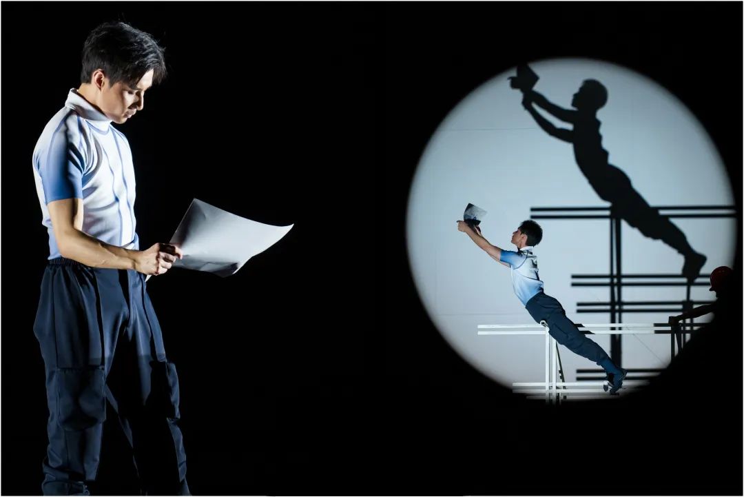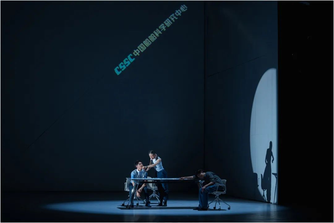 既然是“视觉设计统领”,舞剧完全没有常见的“大幕”开闭。当舞台渐渐朗亮起来,观众似乎被引导到一个类似蒙德里安“冷抽象”的视觉框构中。空阔的框构中似乎有一位坐在办公转椅上凝思的男舞者,随着他和办公转椅协同中的舞动,空阔框构的背景上出现了时而是计算公式、时而是模型草图、时而是云诡波谲的光影变化……你当然很容易读解为这些都是台上舞者飘飞的思绪,只是后来我们感知到这是编导用来表现科研人员“伏案研究”的基本手法时,我们才悟觉到舞剧表意的“视觉设计统领”,是为了将内蕴的“思绪”外化为可感的“形象”。背景上的“思绪”随着办公转椅上的舞者渐渐隐去,而此时下场门一侧的后区出现了一个“房间式”的框构,一阵闹铃将观众的注意力吸引过去:框构中有一方案台,围着案台的三人有一人仍在梦乡;另外一男一女在案台边的舞蹈,似乎在诉说又鏖战了一个通宵。很显然,编导通过这种呈现方式,说明此间的仍在梦乡者便是开场时的思绪飘飞者,并且用“案台”这一物件直言就是在“伏案研究”。从舞剧叙述的通例来看,那位率先亮相的便是中年科研骨干林楫,稍后出现的两人分别是青年骨干李想和苏恬。当李想和苏恬唤醒林楫后,三人就着一张办公转椅的推滑,舞出了一段具有“团结协作”的动态的舞蹈;而当两位保洁员清扫廊道时,则说明我们的科研人员又熬过一个不眠之夜。这一段叙述消失,上场门后区一侧上端,一个略小的光区似乎也在表达科研人员度过了一个不眠之夜,光区中一位戴着眼镜的长者伸了伸懒腰,他应该就是此项科研的领军人物彭河海,而那个略小的光区在舞剧中的定位就是“家”的空间。我们之所以不厌其详地描述这个开场,一是借编导的叙述来把握剧中的四位主要人物;二是通过其叙述方式来把握编导的叙述理念,即不避“图解”的直截了当和随“物”而舞的视觉设计。
