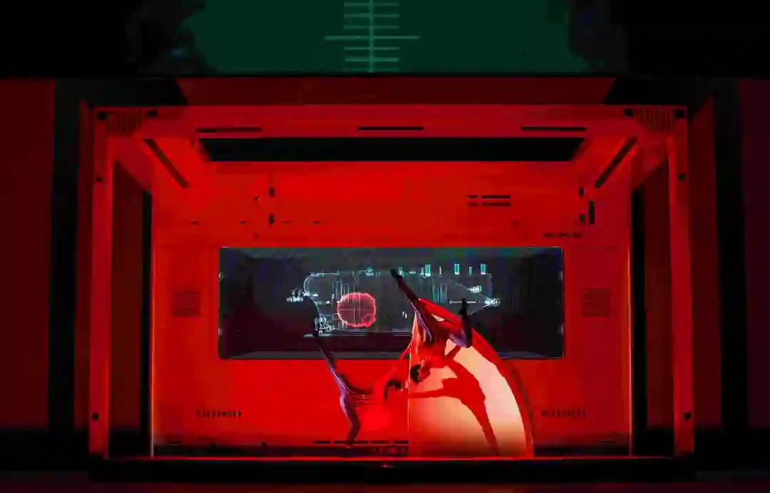 至此,观众应当已经熟悉了舞剧这种不乏新意的叙述方式。显然,完成“拼接”后的“测试”是一个更为复杂的环节,这当然就是对“测试”的舞蹈表现而言。天幕上先是一个时钟标志,显示的是23:35;在其下是潜水器的AI模型图,而这个模型图正是舞台下场门一侧“四人圆桌会议”研讨的内容。圆桌旁的四人,彭河海在桌后面朝观众,桌前背对观众的是林楫,李想、苏恬则在圆桌左右两侧。四人的圆桌交流之后,各人带着自己的办公转椅滑动起舞——仍是随“物”而舞的编创理念使然。此时由上场门一侧步入一队在电脑工作台操作的女子群舞,上述四人融入群舞之中,这当然也符合“特定情境使舞蹈动态特异化”的编创理念……一阵忙活之后,天幕上投放出“球形载人舱推演错误”的字样;好在观众已经适应这种“融媒体”表现的理念,兴致勃勃地看到彭河海、林楫等四人再回到圆桌旁研讨、攻关……随着两位保洁员的穿插,天幕上的时钟先是03:28,然后是06:42——暗示着“通宵达旦”已是工作常态了……此时再度出现了林楫与办公转椅的舞蹈,仿佛是开场时那段舞蹈的“动机”重现,但此时天幕上出现的已是他对“深海下潜”的渴望——在一只硕大的“水母”漂来荡去后,舞台上出现了真正的“奇观”:九条自舞台顶棚下垂的“瑜伽威亚”,在九位女舞者的漂浮荡漾中形成了舞剧中首次出现的“舞蹈奇观”……这段非常符合人物梦想的舞蹈,后来在2024年央视春晚升华为《锦鲤》名声大噪,而该舞的主创标示的便是“汤成龙创意”!在舞剧《10909》中,这段由“瑜伽威亚”促成的“特异化舞蹈动态”,它所表达的这一项目设计、实施者的意象,诗意化的表达叫做“逐梦深蓝”。其实,如果央视春晚的《锦鲤》能关联舞剧《10909》“逐梦深蓝”,它不仅会像晚会中《青白》那样为尚未出品的舞剧《唯我青白》先行发声,而且会产生对我国无数默默奉献的科研工作者赋能、致敬的功效。