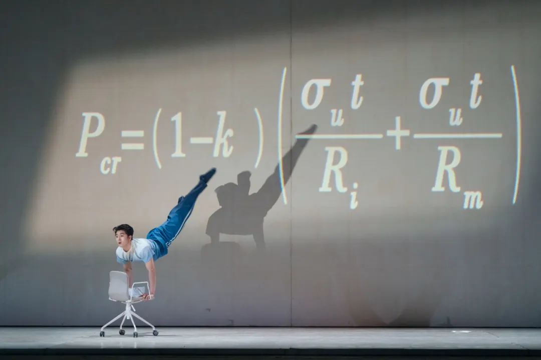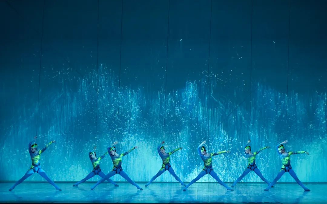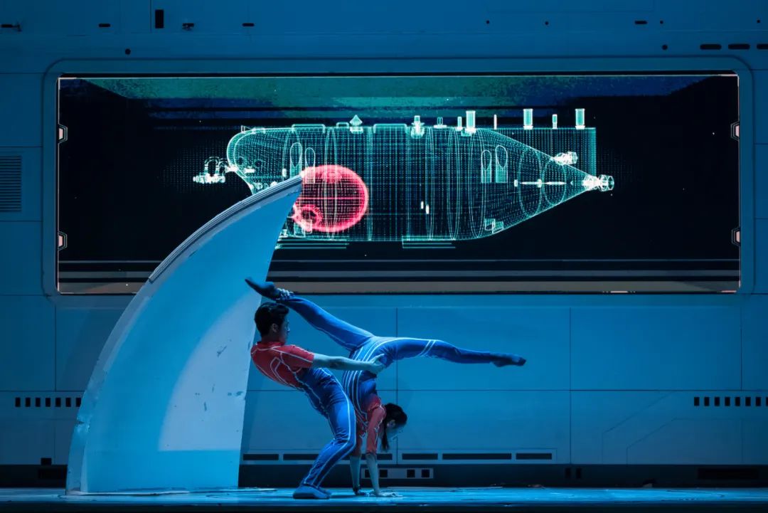 该剧视觉效果拉满,与CAVE投影技术的运用也有很大关系。舞台上的投影不仅仅是简单的背景布置,它与舞者动作、情感表达和剧情推进形成了完美的融合。通过细腻的视觉画面和生动的场景动画,观众能够更清晰地理解人物的内心世界与冲突。在某些关键时刻,画面投射出的语汇符号和意象能够瞬间唤起观众的共鸣,使得情感的传递更加直观而深刻。舞剧开头使用海底特效的视觉影像,观众有一种身临其境、置身深海的沉浸式体验感,有利于环境氛围的营造。第一次梦境舞段,男主身后浮现的公式、设计图,将他脑海中的思绪如电影般呈现,舞蹈语汇与投影水乳交融、交相辉映。压强测试舞段,舞台空间上下两分,投影交代了演员的行为动机,解决了舞剧没有台词的困境。当男主高举设计图纸,舞台上空出现科技感极强的裸眼3D拆解视频,内容便是设计图纸,特效视频又发挥了“放大镜”的作用。背景投影数次出现梦幻般的大型海洋生物,海底世界的未知和神秘贯穿始终。