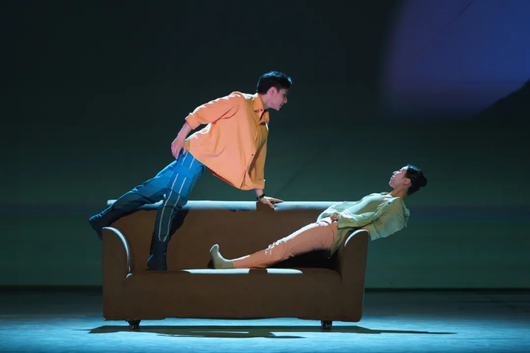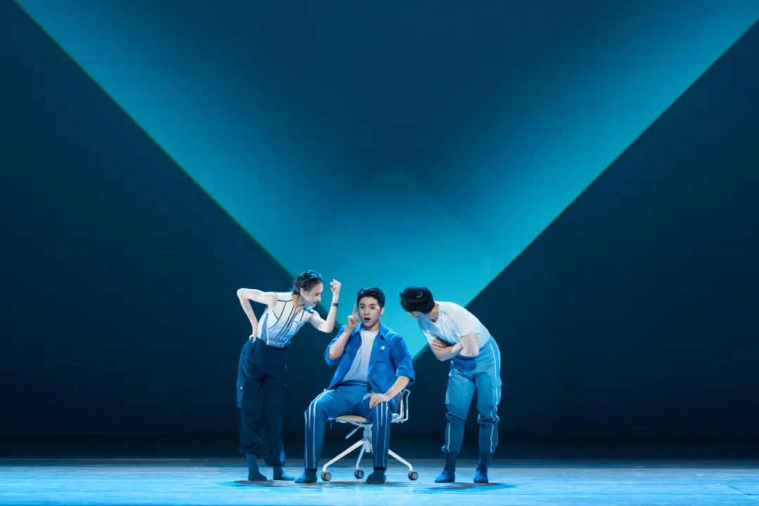 独舞《向往浩瀚》,舞者巧用椅子滑动,仿佛在海水中轻盈摇曳,动作逐渐流畅,如潮水般渐次展开,以此展示科研工作者犹如漫步在星光闪烁的浩瀚深海,内心澎湃的情感如海浪般涌动,对万米之下的探险之旅充满憧憬。群舞《不眠不休》,既有所总工程师、“奋斗者”号总设计师等用舞蹈的肢体语言演绎头脑风暴,也有更多科研工作者在电脑上专注工作,桌椅的滑动流畅而有韵律,伴随着白天与黑夜的不断交替,中国载人深潜精神在这里得到生动诠释。双人舞《回家》,沙发除了交代场景,也成了科研人员家庭情感交流的载体,推拉沙发以及在沙发上的有限空间里,科研工作者的生活状态与丰富情感得到生动而立体的呈现。