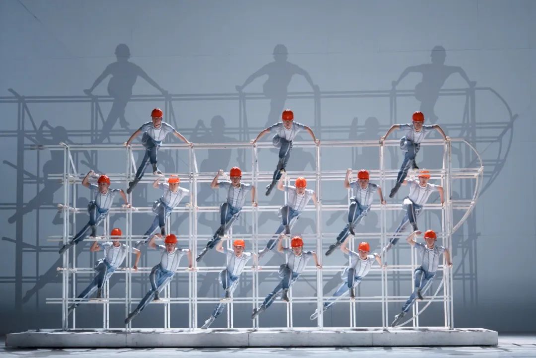 群舞《组装拼接》,舞台上设计了载人潜水器的骨架结构,围绕这一特定情景的“用舞之地”,出现了施工者在骨架上分上中下三层的“拼接舞”,“奋斗者”号总设计师攀上骨架的独舞,以及他与两名科研工作者再攀骨架的三人舞等,其立体感、力量感颇有突破意味。