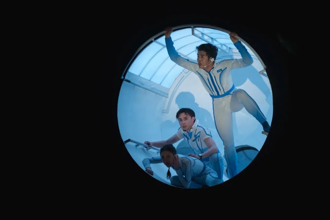 三人舞《极限深潜》,是球舱下潜过程中的舞段。面对水压的压迫、黑暗的笼罩、未知的恐惧,以及技术和生理的极限挑战,三位舞者以缓慢而沉重的动作,模拟球舱在深海中艰难前行的姿态,身体扭曲、肢体紧绷,仿佛被无形的力量所牵引,每一步都充满挣扎和抵抗。他们的表情凝重,眼神中透露出不屈和坚持,通过肢体的扭曲与延展,展现出极端环境下,人类对于探索未知、突破自我极限的渴望与决心。随着音乐的变化,三位舞者随黑烟囱导致信号失联的剧情走向,开始尝试挣脱这束缚,动作由拘谨转为激烈,仿佛是在与深海的力量进行着无声的较量。联想到师傅和家人的叮嘱,空间因为三人的思绪而发生改变,三人通过威亚从“盒式结构”顶部缓缓落下,在海底自由奔腾。直至恢复信号,他们仿佛突破了所有的限制。这段舞段不仅是对“奋斗者”号下潜过程的艺术化再现,更是对人类探索与突破精神的深情礼赞。