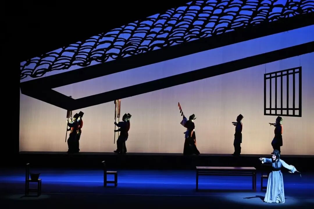 最后作为大轴的《心•痴梦》以撑满舞台的崔氏独角戏铺开,极具张力且惊喜不断。开篇快速交代故事背景和人物关系,立住了崔氏贪婪市侩、嫌贫爱富的人物底色,随后崔氏的艳羡、痴妄、悔恨交织的情绪就有了依托,逐步升级的矛盾心理外化为崔氏在梦中披上“凤冠霞帔”的痴傻、疯癫状态。舞台上方的一个巨大方框俨然成为了崔氏欲望的象征,既是一片遮头的瓦,也是其内心无限扩张的欲望牢笼,终日悬在头顶……