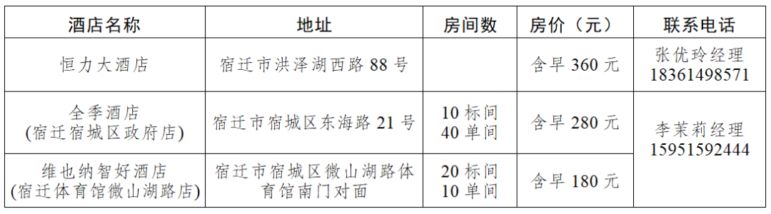 2.经主办方与承办地相关酒店沟通,学员可享受房间商议价,请于7月20日前致电酒店联系电话,报培训班名称确认预留房间,超时未预订者,将不保证有商议价房间。酒店及联系方式见下表,解释权归酒店所有。