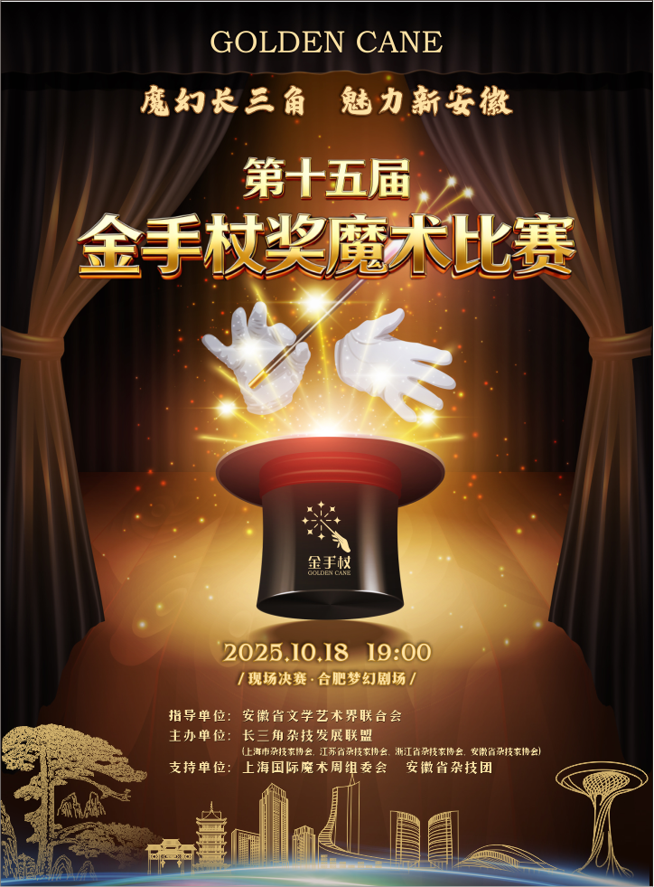 由省文联指导,长三角杂技发展联盟(安徽省杂协、上海市杂协、江苏省杂协、浙江省杂协)主办,上海国际魔术周组委会与安徽省杂技团支持的第十五届金手杖奖魔术比赛,将于10月18日19:00在合肥梦幻剧场开幕。
