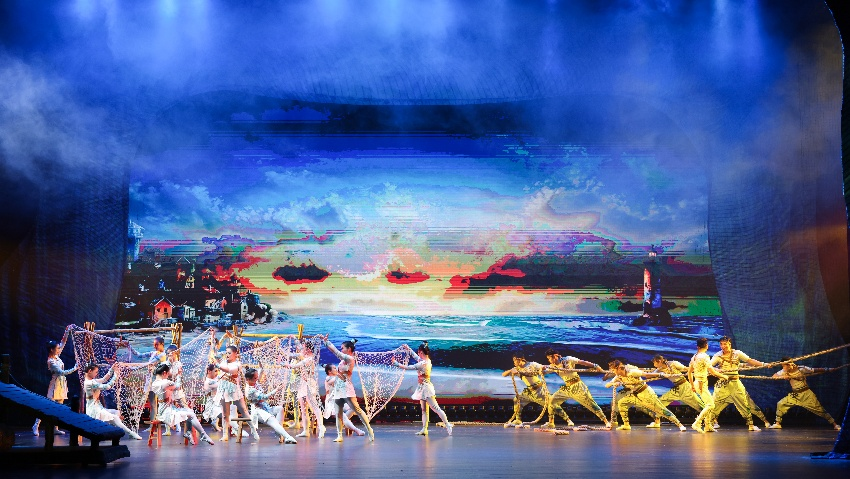 《寻梦出海记》不仅是一场艺术展演,更是一次文化IP的创造性突围。剧中欢乐祥和的渔村生活、勇敢坚韧的渔民形象、悠远动人的渔歌号子、珍稀海洋生物以及“跳马夫”等非遗元素的有机融入,共同勾勒出如东地域文化深沉而鲜活的精神图谱。全剧洋溢着浓郁的“江风海韵”,在技艺共融的舞台叙事中,传递出人与海洋共生共荣的生态智慧。