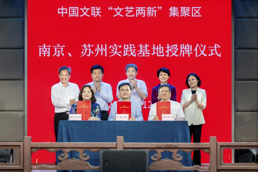 授牌仪式上,诸迪为中国文联“文艺两新”集聚区南京、苏州实践基地授牌。李翔分别与南京文联、苏州文联签署《中国文联“文艺两新”集聚区实践基地•江苏省南京市熙南里历史文化街区合作备忘录》《中国文联“文艺两新”集聚区实践基地•江苏省苏州市平江文化中心合作备忘录》,诸迪、常胜梅、孙百军、刘轩明、冯雯兰共同见证。孙百军致辞。授牌仪式由刘轩明主持。