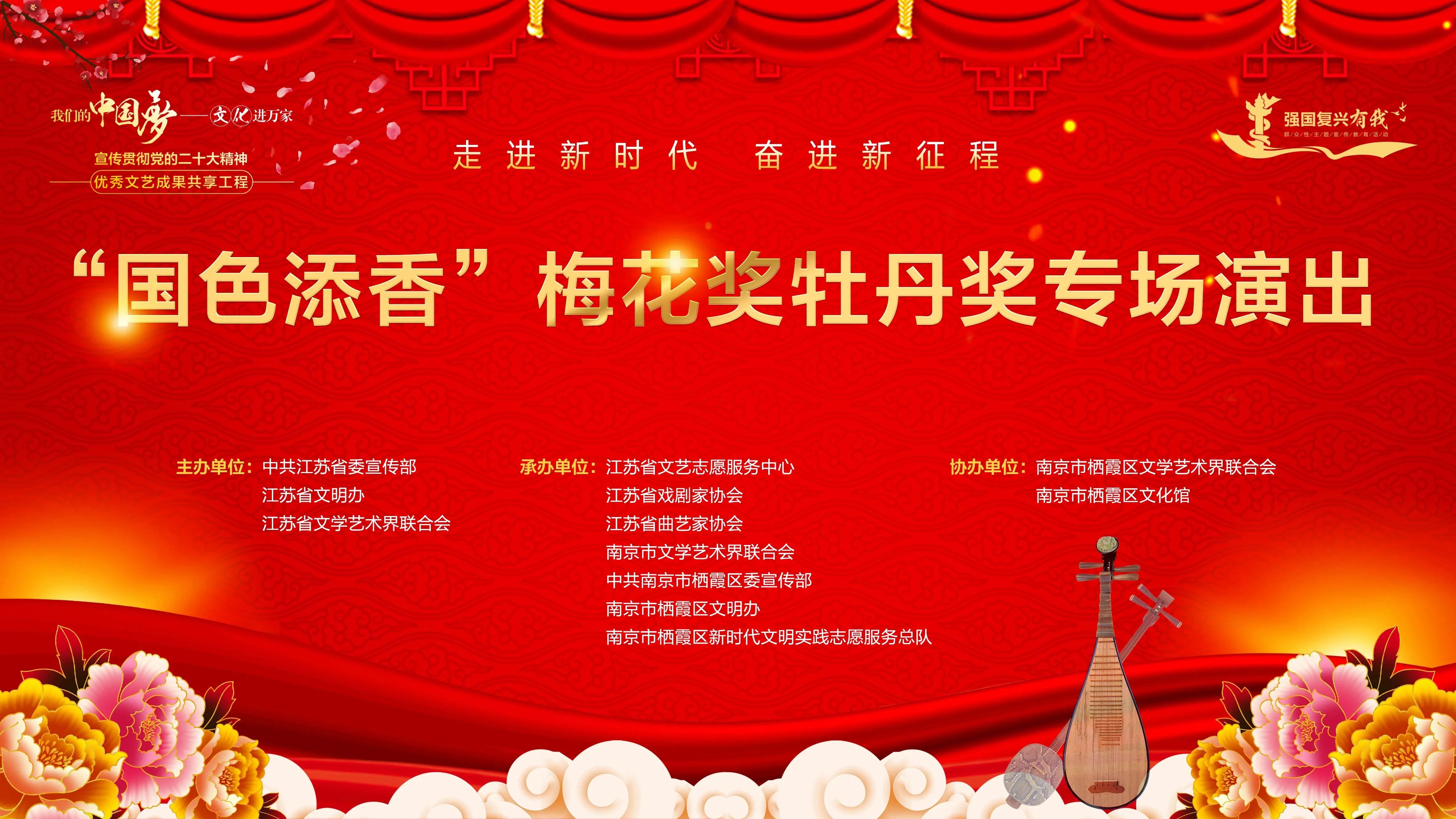 牡丹绽放春世界,梅花清香满乾坤。在全国上下深入学习宣传贯彻党的二十大精神之际,由中共江苏省委宣传部、江苏省文明办、江苏省文学艺术界联合会主办,江苏省文艺志愿服务中心、江苏省戏剧家协会、江苏省曲艺家协会、南京市文学艺术界联合会、中共栖霞区委宣传部、栖霞区文明办、栖霞区新时代文明实践志愿服务总队承办,栖霞区文学艺术界联合会、栖霞区文化馆协办的“我们的中国梦”——文化进万家、优秀文艺成果共享工程——“国色添香”梅花奖牡丹奖艺术家专场演出,将于7月16日在南京栖霞区文化馆举行,以实际行动传承弘扬中华优秀传统文化,讲好中国故事、传播好中国声音,让人民聆听到自信的中国迈向复兴的洪钟大吕、时代壮歌。