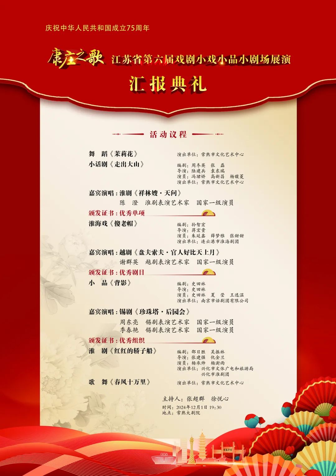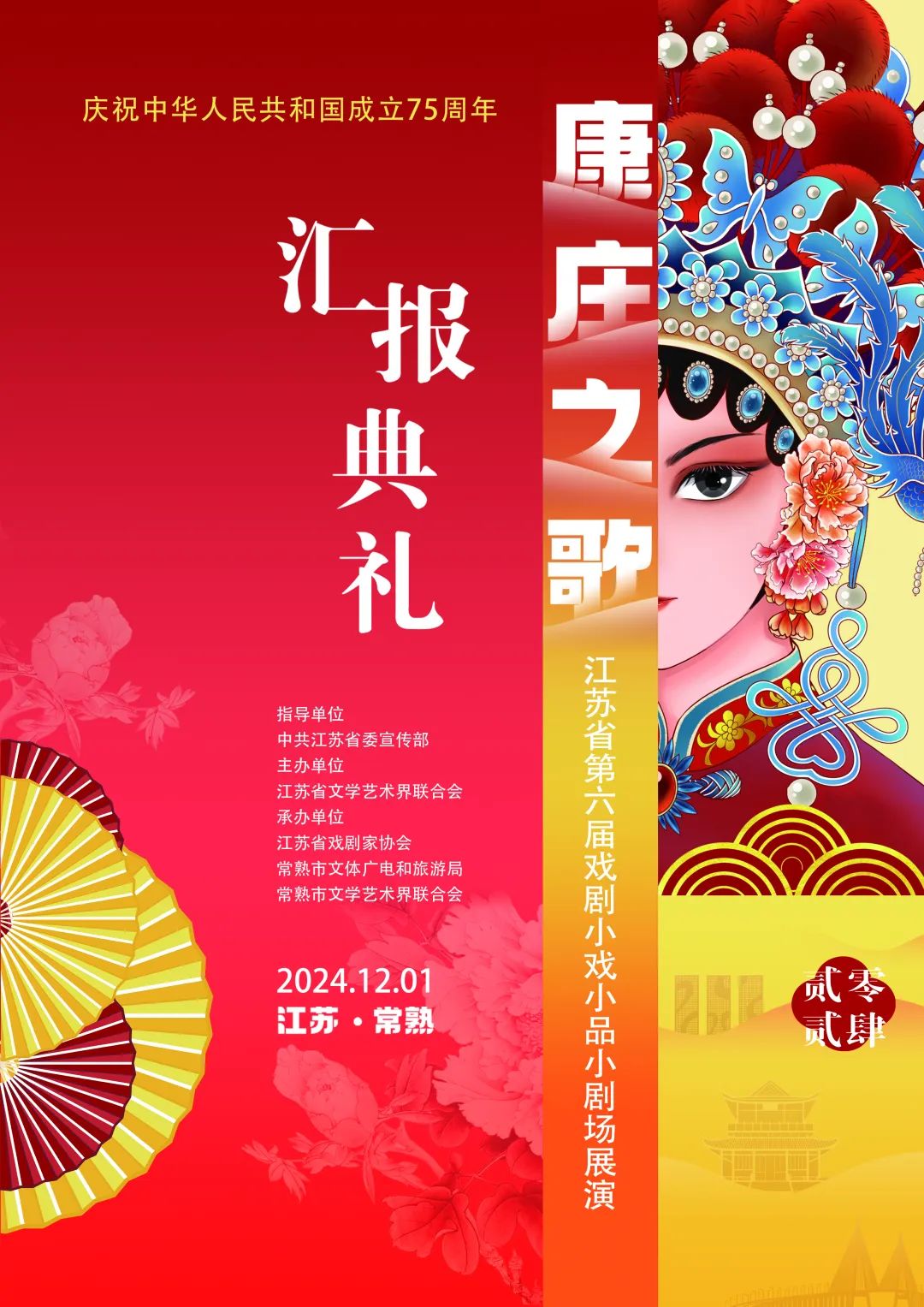 庆祝中华人民共和国成立75周年——“康庄之歌”江苏省第六届戏剧小戏小品小剧场展演汇报典礼将于12月1日19:30在常熟大剧院精彩上演,届时将通过“江苏文联”视频号、“江苏公共文化云”平台、“常熟市文化艺术中心”视频号直播。