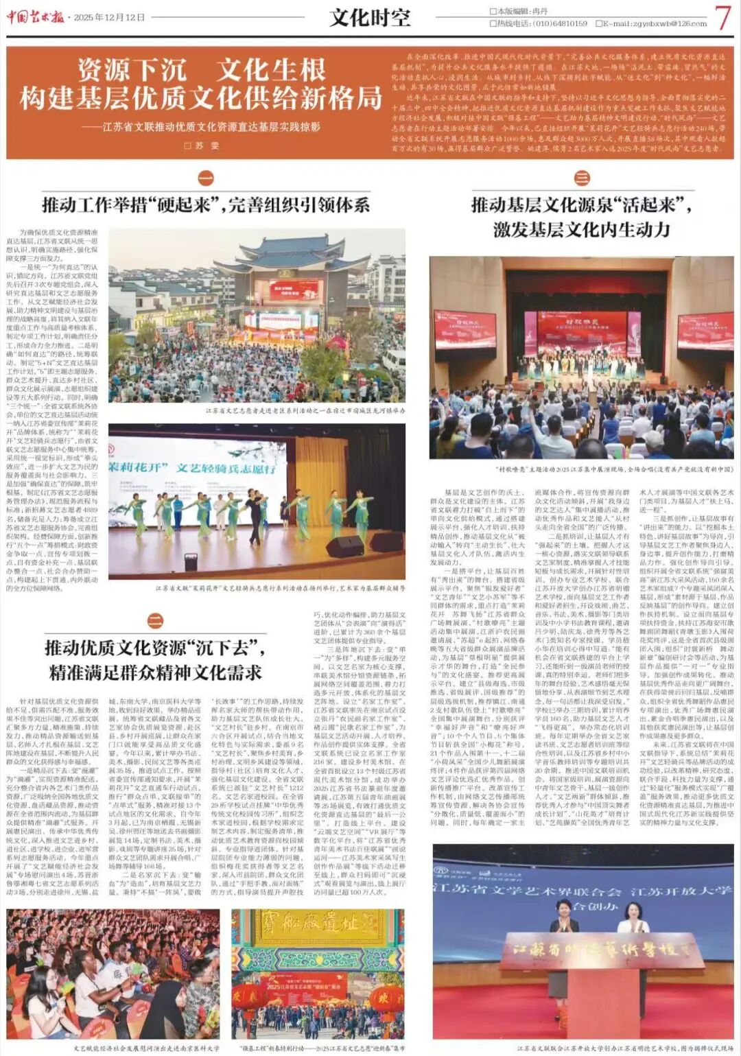 基层是文艺创作的沃土,群众是文化建设的主体。江苏省文联着力打破“自上而下”的单向文化供给模式,通过搭建展示平台、强化人才培训、扶持精品创作,推动基层文化从“被动输入”转向“主动生长”,壮大基层文化人才队伍,激活内生发展动力。