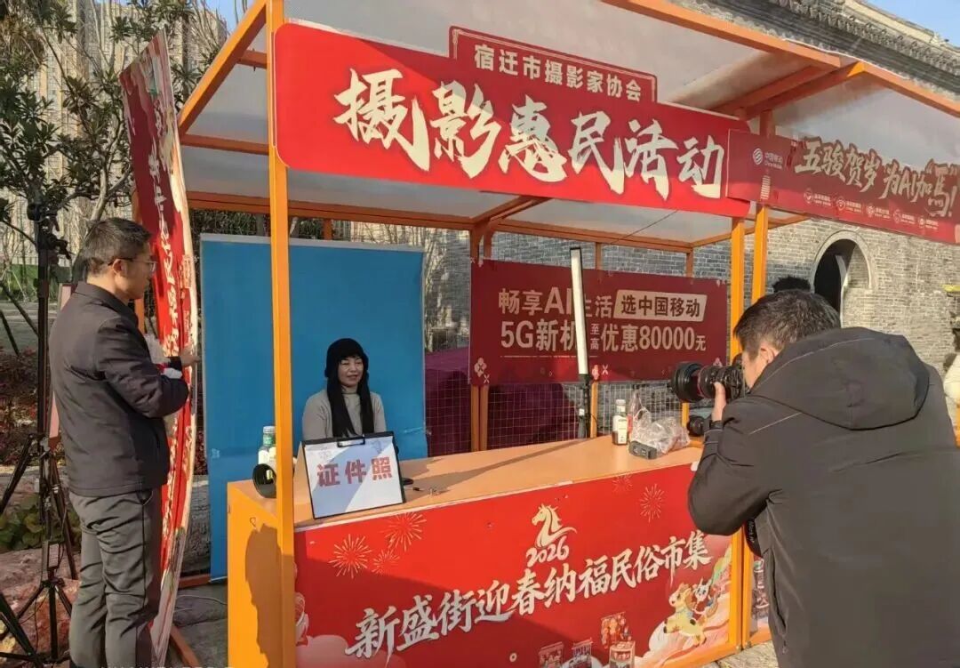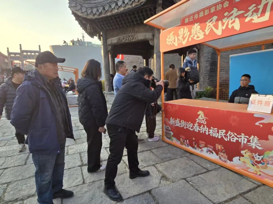 2026年2月17日至21日(正月初一至初五),省摄协副主席、宿迁市摄协党支部书记陆启辉带领摄影工作者在宿迁市区百年老街新盛街开展摄影惠民服务,免费为市民拍摄证件照,并为新盛街活动拍摄宣传图片,受到广大市民的欢迎。