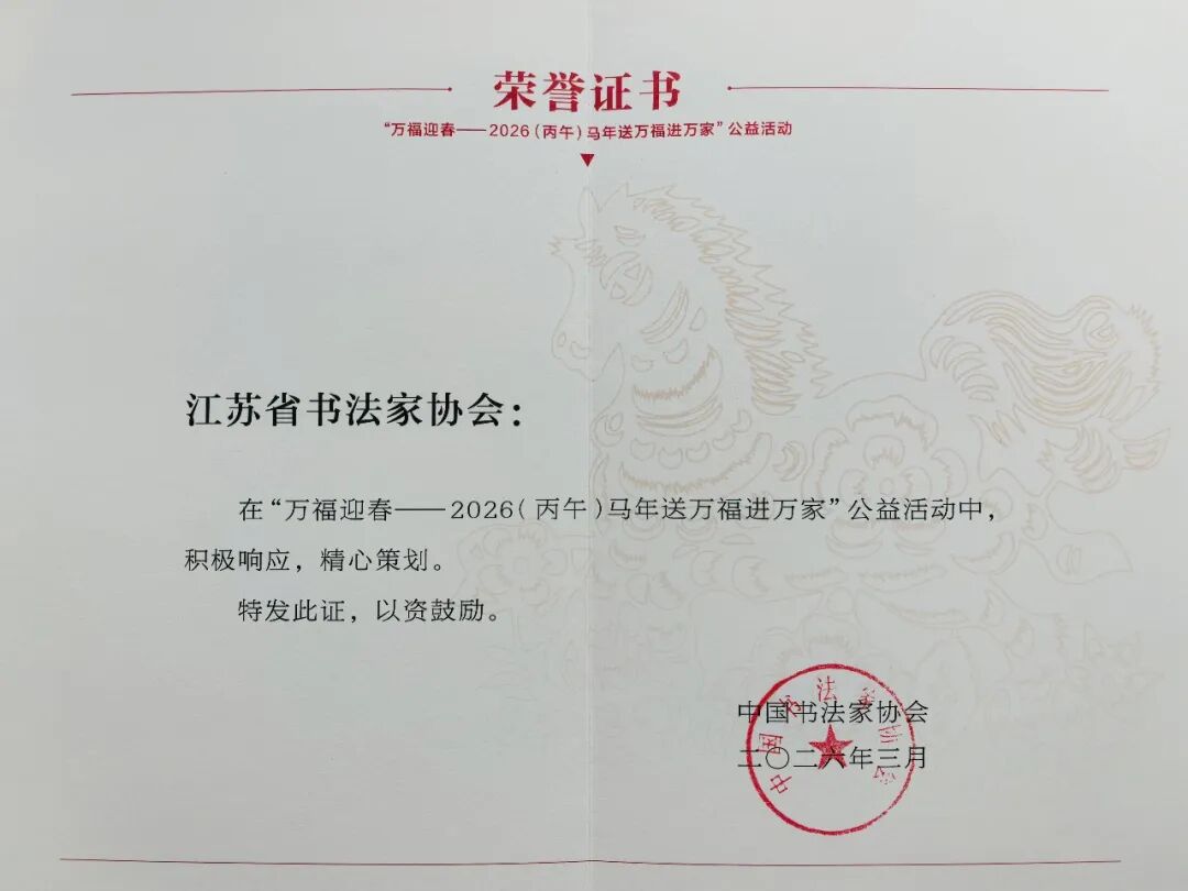 3月22日至24日,中国书法家协会2026年度工作会议在贵州铜仁召开。会议期间,中国书协对“万福迎春-2026(丙午)马年送万福进万家公益活动”先进集体和个人进行表彰,江苏省书法家协会荣获优秀团体会员称号,无锡市、徐州市、扬州市、宿迁市、南京市五市书法家协会获评先进集体,戚散花、孙志勇、赵锟三位同志荣获先进个人称号。江苏省书协还在会上作了主题为“固本强基 精准服务——推动江苏书法事业高质量发展”的经验交流发言。