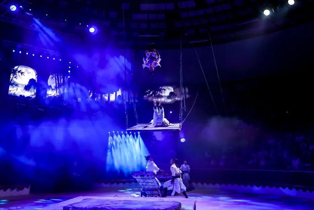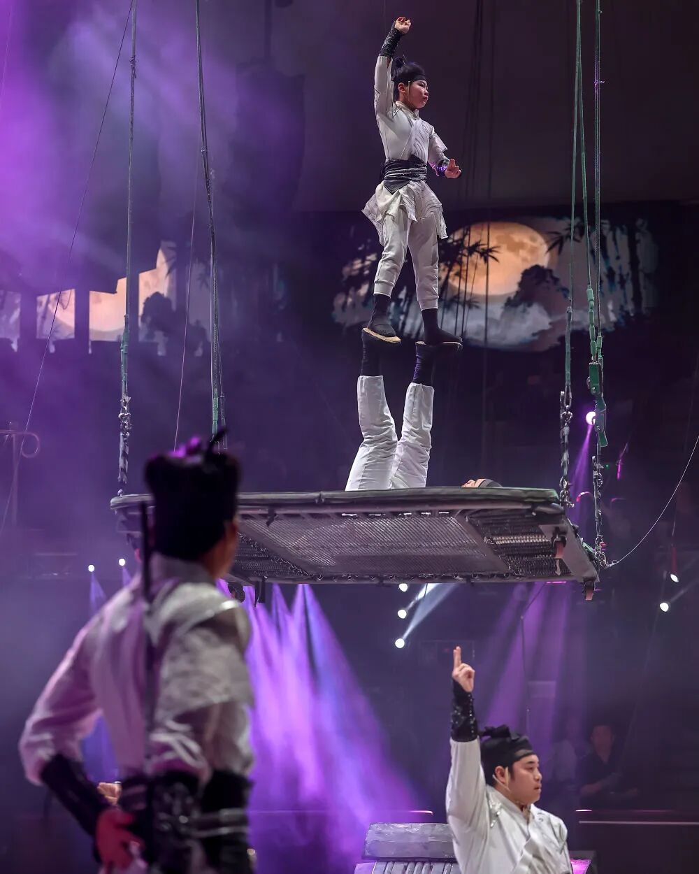 以上图片均为江苏省杂技团演员在表演《凌云踏浪——跳板秋千蹦床》