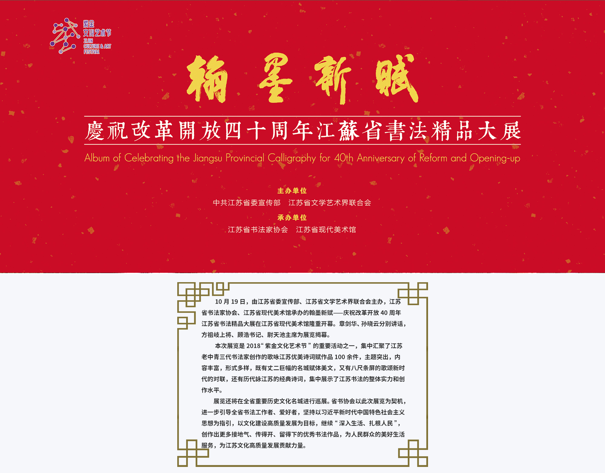 10月19日,由江苏省委宣传部、江苏省文学艺术界联合会主办,江苏省书法家协会、江苏省现代美术馆承办的翰墨新赋——庆祝改革开放40周年江苏省书法精品大展在江苏省现代美术馆隆重开幕。