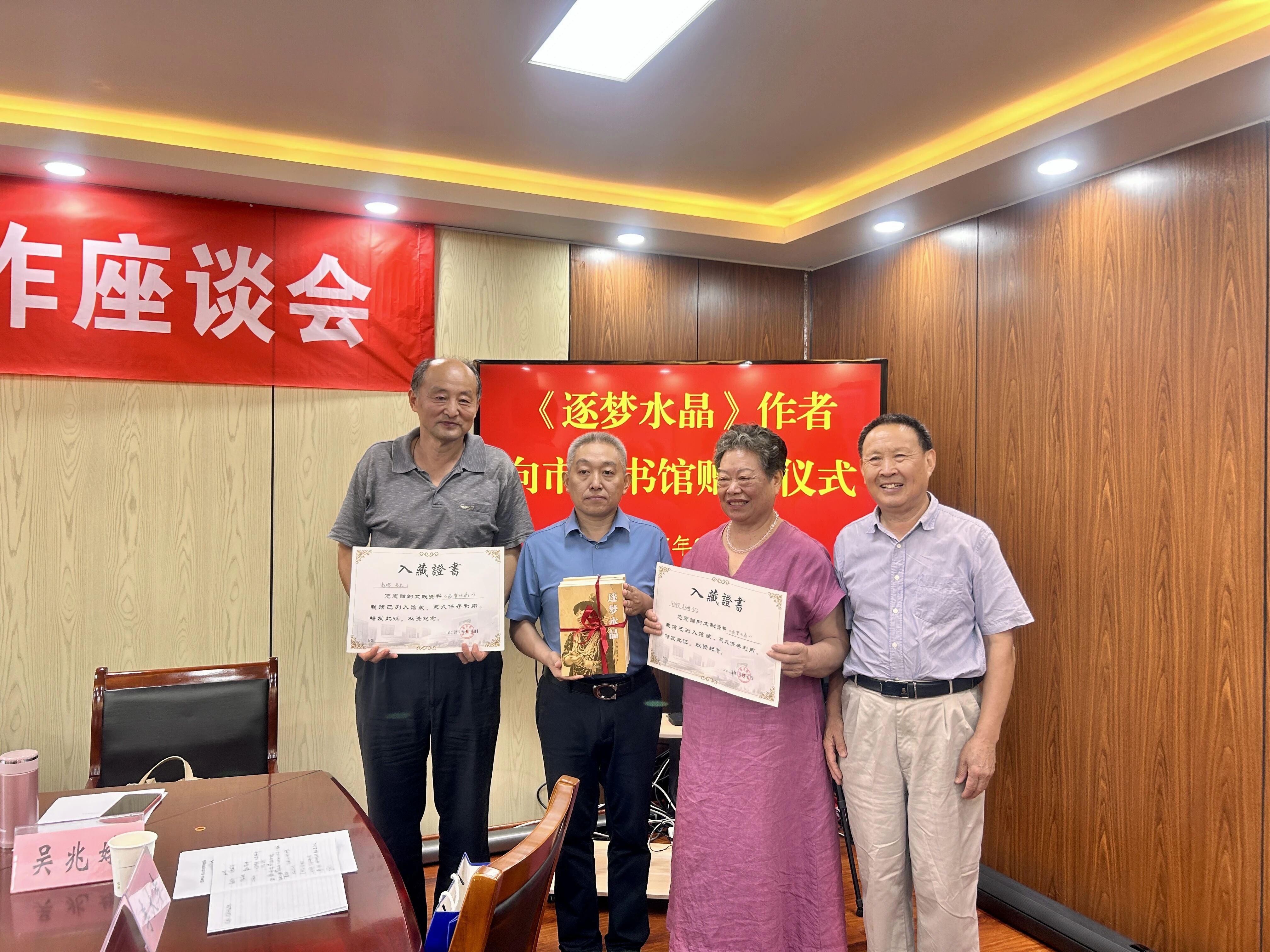 活动现场,赵鸣和吴兆娥、合著者周守芝一起向市图书馆捐赠作品《逐梦水晶》,梁继东代表市图书馆向他们颁发入藏证书。