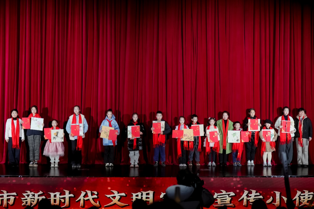 全国劳模、全国人大代表李承霞,全国三八红旗手、中国敬业好人汤亚平,中国好人、道德模范翁雪坤等代表为15位青少年颁发“新时代文明实践宣传小使者”称号,以榜样力量推动文艺传承与品德教育相结合。